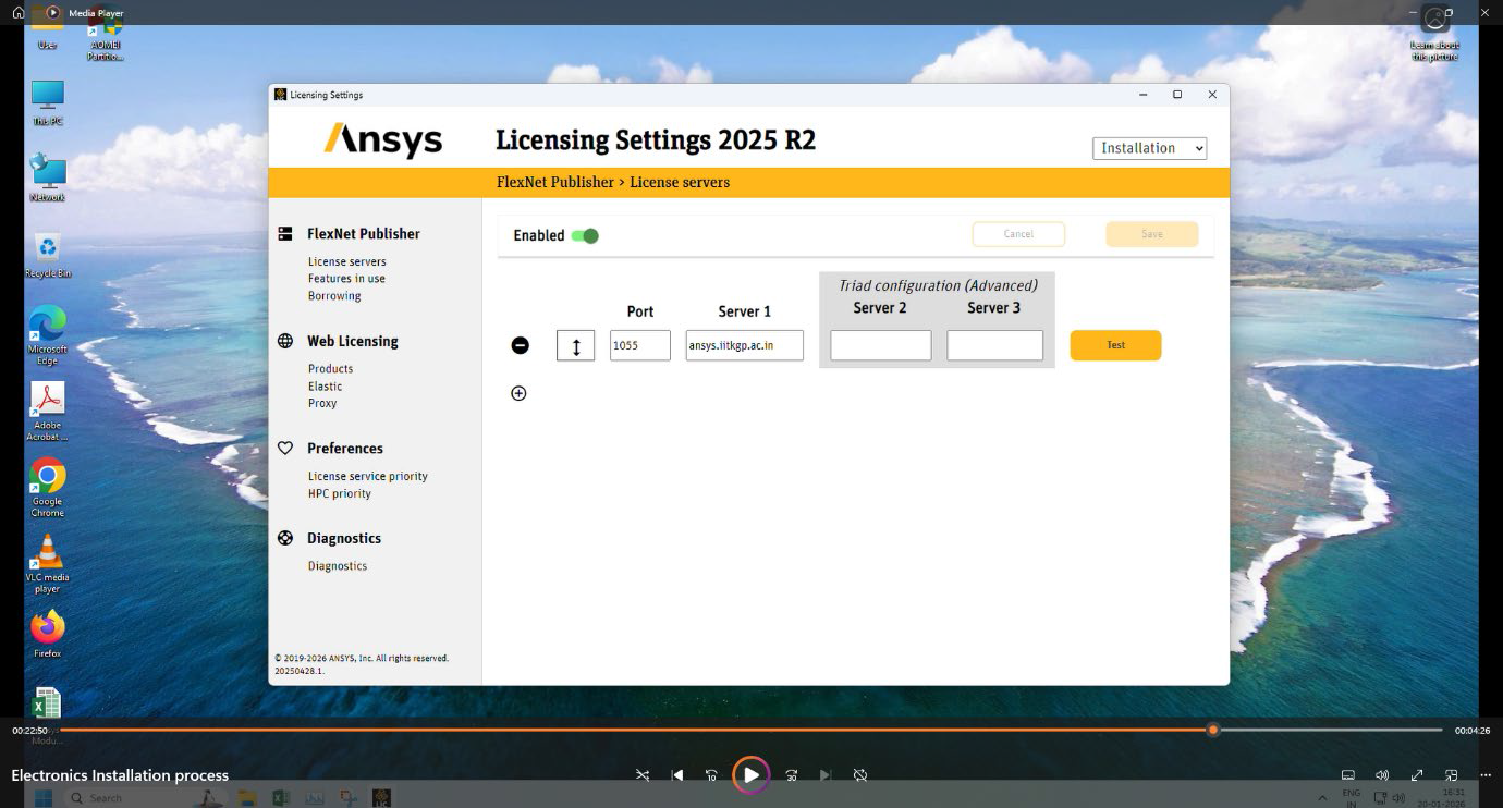 13. Select Enabled, Port 1055 and Server 1 as ansys.iitkgp.ac.in . Then click Test